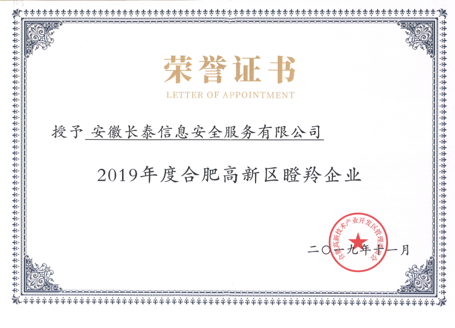 2019年,11月20日,合肥高新区2019年高成长企业榜单正式发布,高新区共认定了502家高成长企业,其中雏鹰企业275家、瞪羚培育企业72家、瞪羚企业149家、潜在独角兽企业3家、独角兽企业1家、平台型龙头企业2家。作为其中的高科技企业——安徽PG官方版网站登录入口-PG(中国)成功入选瞪羚企业榜单。
